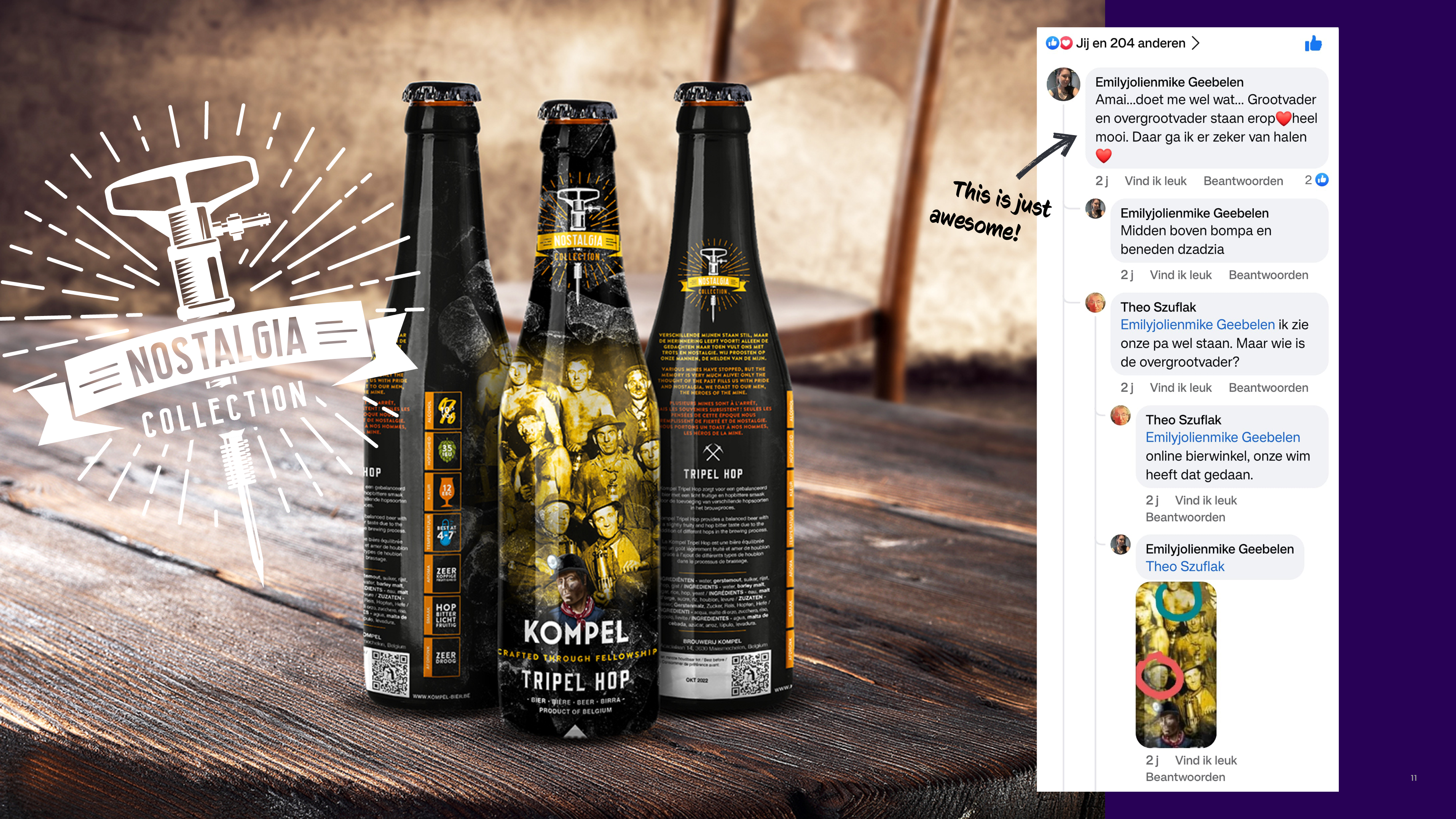 Bij de lancering herkende een bezoeker zijn grootvader en overgrootvader op een etiket. Dat moment maakte duidelijk dat dit project meer was dan packaging: het creëerde trots en verbondenheid. De Nostalgia Collection groeide uit tot een verzamelaarsitem en genereerde een actieve community op social media. Kompel werd niet alleen een brouwerij, maar een merk dat erfgoed tastbaar en deelbaar maakt, en kreeg hierdoor een stevig fundament voor verdere groei met nieuwe lijnen en samenwerkingen.